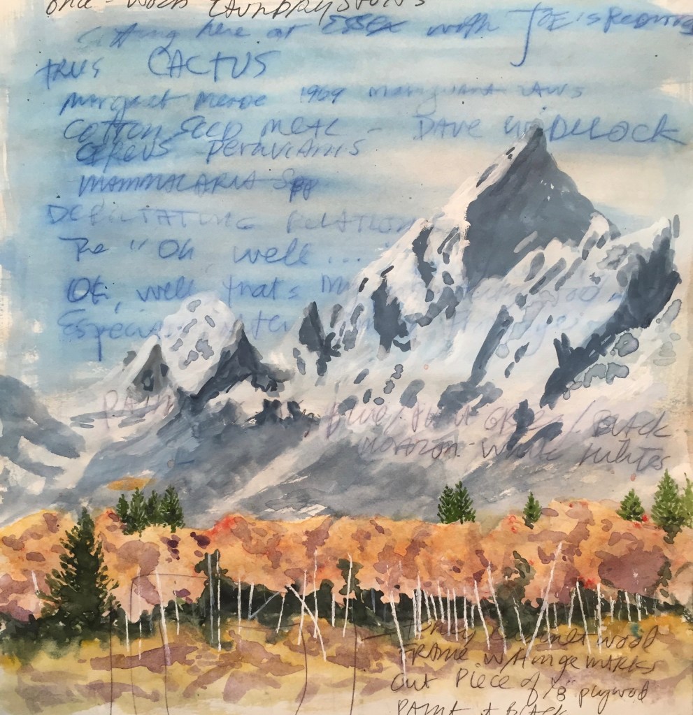 Did I paint this then? No, I bought spiral bound sketchbooks and filled them with drivel and lists, complaints and yes, ideas, in my unreadable scrawl. Later, much later, I am painting over the bitter tears and nonsense with what should have been. Not too late.